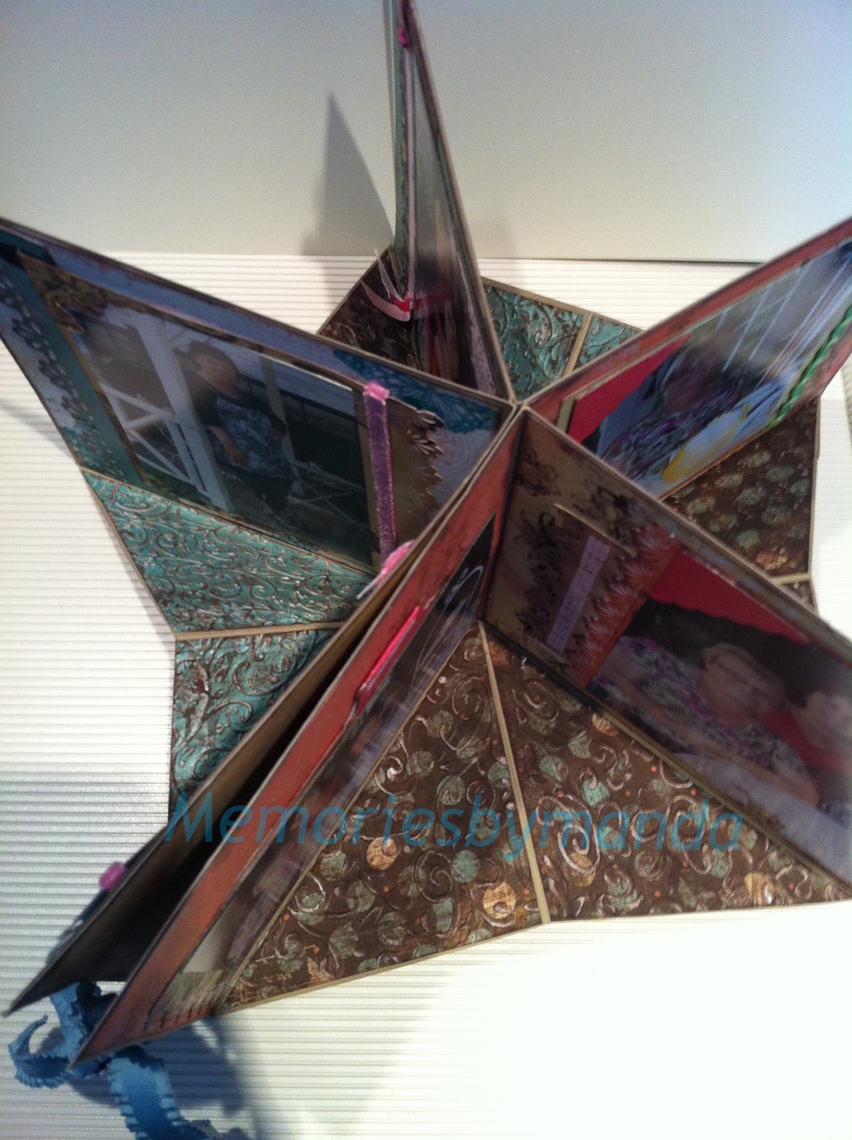 Thanks to Prima's Ustream channel I learned how to make a journal book by watching an online class led by Steff Miller over and over and over again. 'That is a cool idea' I thought and proceeded to make one for myself (or for a friend as it turns out). The original journal is 7.5" by 3.5" but mine is 6" by 3.5". The original was also made with 12x12 double-sided patterned paper but, of course me being me, mine was made with 6x6 single-sided papers as well. Makes it more difficult for sure. If you had 4 12x12 pieces of double-sided papers you could whip this up fairly quickly: