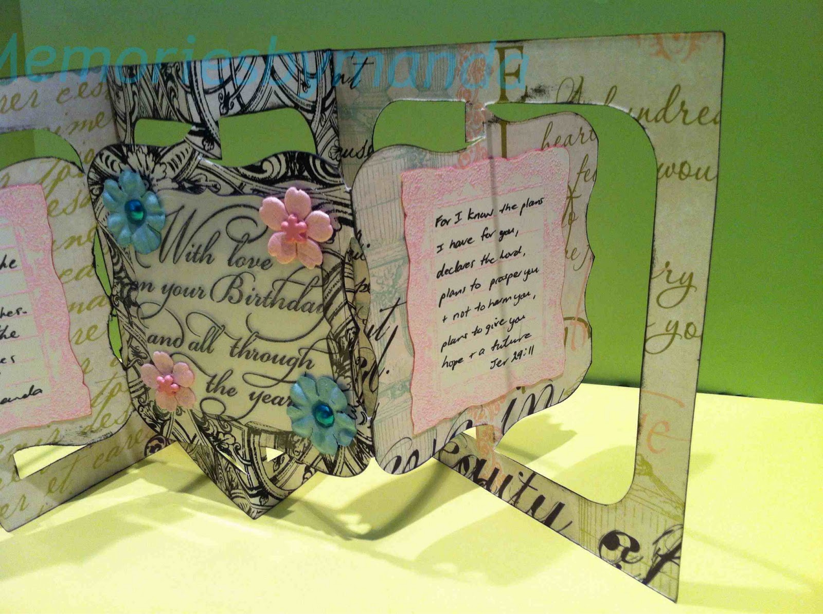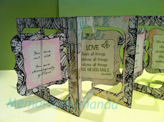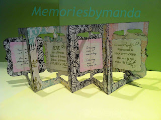 A friend recently had a BIG birthday so I thought I better make a BIG effort for her card. A Sizzix accordion die recently came to live with me so I pulled it out and had a play. A word of advice: don't try this for the first time with a script piece of paper. It makes it very difficult if you are learning how to put it together with the added stress of making sure the script is the right way! Won't make that mistake again. If you look closely you will notice that the script is upside-down on at least one side - just don't look that closely now that I said it.