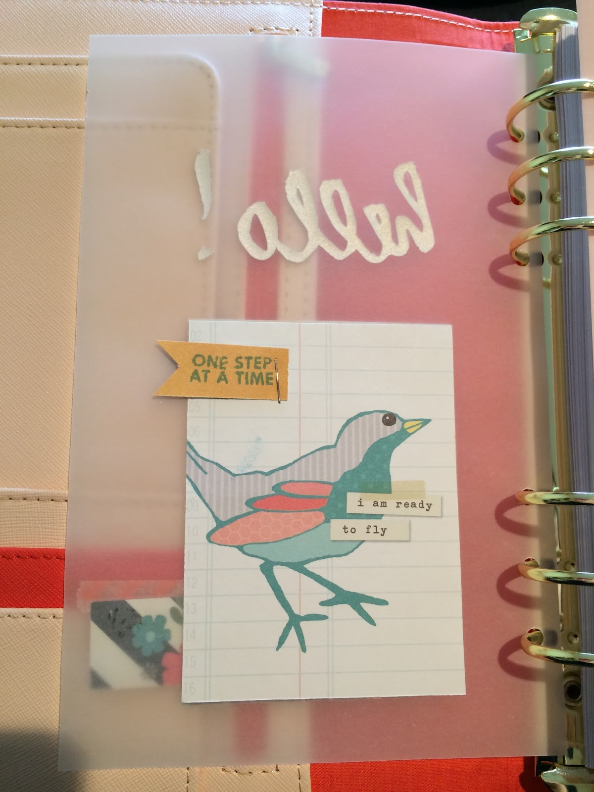 It is important to note that I have packed up my creative space recently. I haven't had the time or the products available to me but I managed to create something with the limited resources I have on hand. A few ordered items winged their way to me while my craft gear is packed away and I decided to re-purpose some of the packaging. I got a new Webster Pages Folio (love these things - you can get them at SSS) and they come with a piece of vellum with the word "Hello" embossed in gold. I'm not one to let a lovely piece of work go to waste. I used the vellum to make a dashboard (?) for a newly acquired Kikki-K planner (she's blush and tangerine coloured - gorgeous). I say dashboard (?) because I'm not sure I understand what a dashboard is! In this case I used it as a decorative cover page for my planner.