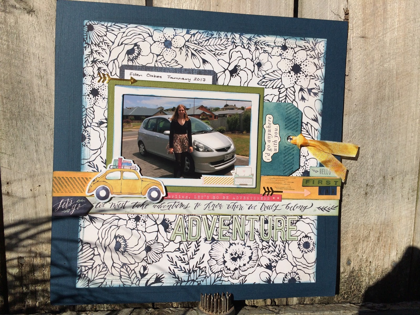 I made this layout with leftovers from my kit from a class with Vicki Boutin at CAD 2015. I don't always have coordinating craft supplies so it was great to have the coordinated items on hand. When I saw the sticker - I'd go anywhere with you - I knew I wanted to use it with this photo. The adventure sticker was a last minute addition. I figured it was on the coordinating sticker sheet so it was bound to go with my layout.